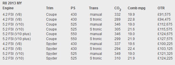 Current Audi Supercars - Buyers Guide 2021 Audi R8 Range. The price range for the Audi R8 varies based on the trim level you choose. Audi R8 Variants There are 2 variants available of R8.